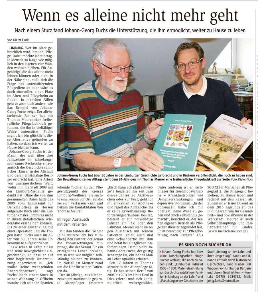 Limburg. Wer im Alter gebrechlich wird, braucht Pflege. Dabei möchte jeder betagte Mensch so lange wie möglich in den eigenen vier Wänden wohnen bleiben. Für Angehörige, die das alleine nicht leisten können oder nicht in der Nähe sind, stellt sich die Frage des unterstützenden Pflegedienstes oder wäre es doch sinnvoller, einen Platz im Alten- und Pflegeheim zu finden. In manchen Fällen geht es aber auch anders, wie das Beispiel von Johann-Georg Fuchs zeigt. Der alleinstehende Rentner hat mit Thomas Meurer eine freiberufliche Pflegefachkraft gefunden, die ihn in vielfältiger Weise unterstützt. Fuchs sagt: „Ich bin glücklich, diese Alternative gefunden zu haben, so dass ich weiter zu Hause bleiben kann.